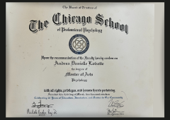 Attended Chicago School of Professional Psychology, Masters of Psychology, Graduated 2019 Additional Credentials include Bachelors of Psychology / Indiana University 2016